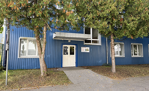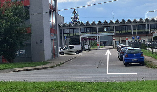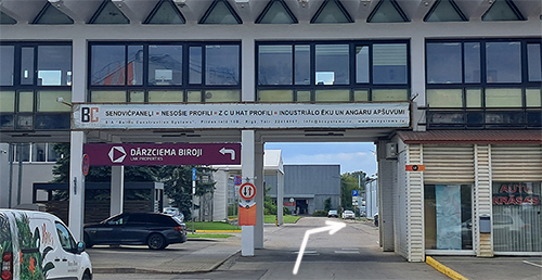 Pēc arkas, pēc 100 metriem labajā pusē – zila ēka.